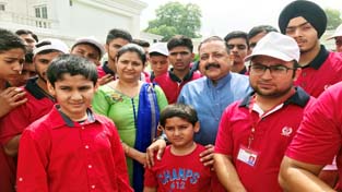 Union Minister Dr Jitendra Singh at a get-together hosted by him for students from Udhampur and Reasi districts, at New Delhi on Sunday.
