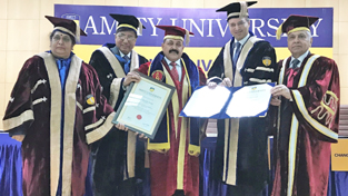 Union Minister Dr Jitendra Singh being conferred Honorary Doctorate by Amity University at a special convocation held as a rare gesture, at NOIDA (NCR) on Wednesday.