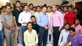 Union Minister Dr Jitendra Singh being felicitated by ABVP activists before they left for Patna to take part in the Bihar election campaign, at New Delhi on Thursday.