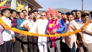 Union Minister Dr Jitendra Singh being given a rousing welcome on his arrival at Pancheri in Chenani Assembly Constituency on Saturday.