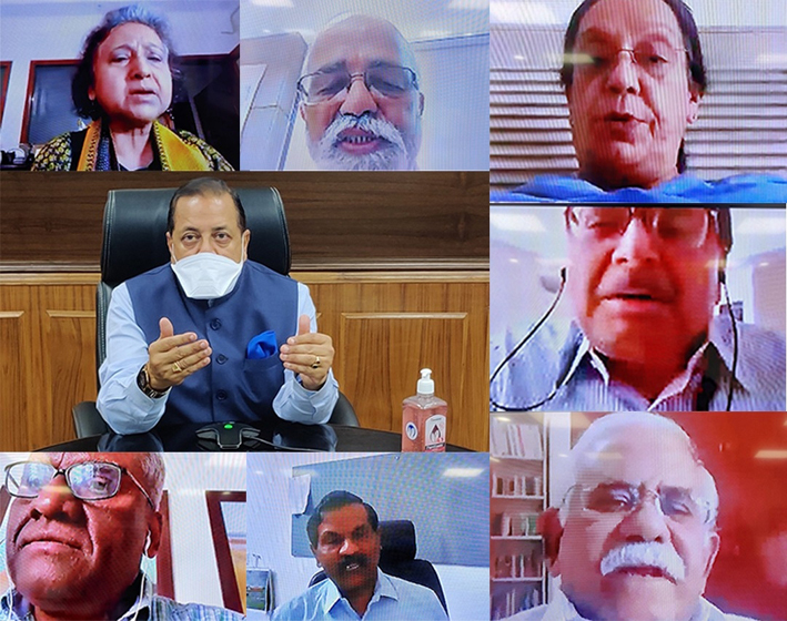 Union Minister Dr. Jitendra Singh discussing COVID combat measures with former bureaucrats from across the country through video conference, on Saturday.