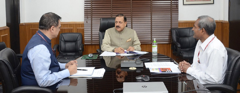 Union Minister Dr Jitendra Singh discussing the conclusions of National Corona Survey conducted across districts in India, with officials in the Union Ministry of Personnel, through video conferencing, at New Delhi on Thursday.