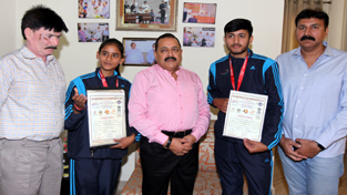 Union Minister Dr Jitendra Singh felicitating Komal and Karan in Jammu on Monday. —Excelsior/Rakesh By Daily Excelsior - October 23, 2018 Share FacebookTwitterWhatsAppPinterestLinkedinCopy URLTelegramEmailTumblrReddItPrintKoo Union Minister Dr Jitendra Singh felicitating Komal and Karan in Jammu on Monday. —Excelsior/Rakesh Union Minister Dr Jitendra Singh felicitating Komal and Karan in Jammu on Monday. —Excelsior/Rakesh Follow our WhatsApp channel
