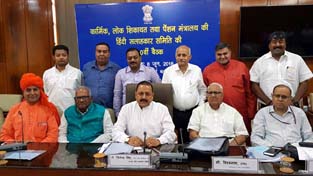 Union Minister Dr Jitendra Singh, flanked by newly nominated members of the reconstituted Hindi Advisory Committee under Department of Personnel & Training (DoPT), at North Block, New Delhi on Wednesday.