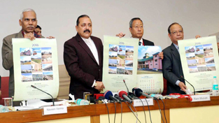 Union Minister Dr Jitendra Singh, flanked by senior officers of DoNER Ministry, formally releasing the Ministry’s 2016 Calendar for Northeast, at Vigyan Bhawan, New Delhi on Tuesday.