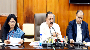 Union Minister Dr Jitendra Singh, flanked by Union Secretary C. Viswanath and senior officers in the Union Ministry of Personnel, Department of Administrative Reforms and Public Grievances, briefing the media at North Block, New Delhi on Thursday.