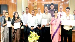 Union Minister Dr Jitendra Singh, flanked by Union Secretary DoPT Ajay Mittal and Union Secretary ARPG C.Viswanath, posing for group photograph after presenting awards and certificates of merit for outstanding handling of grievances by different Ministries, at North Block, New Delhi on Monday.