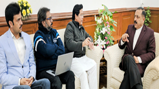 Union Minister Dr Jitendra Singh holding a discussion on tourism promotion plans for Shillong and other surrounding areas of Northeast with a group of professionals led by Member of Parliament from Meghalaya, Conrad K. Sangma and Christy Charles from Planet “M”, at New Delhi on Monday.