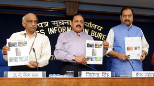 Union Minister Dr Jitendra Singh launching the first-ever Space “Trigger Card” titled “Sakaar” at a press conference at New Delhi on Monday. Also seen in the picture is Chairman ISRO, A. S. Kiran Kumar.
