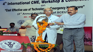 Union Minister Dr Jitendra Singh lighting the traditional lamp before launching the new “Appointment from Home” facility and inaugurating International CME on e-Health Care at AIIMS, New Delhi on Thursday.