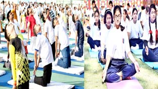 Union Minister Dr Jitendra Singh, MP Jugal Kishore, State President BJP Ravinder Raina performing yoga asanas at Jammu (left) and children performing yoga at Sher-e-Kashmir Sports Stadium in Srinagar (right) on Thursday. -Excelsior/Rakesh/Shakeel