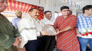 Union Minister, Dr Jitendra Singh being presented traditional Kashmiri utensils symbols of age old culture by Kamal Peshin at a function at Roop Nagar on Monday.