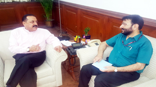 Union Minister, Dr Jitendra Singh receiving a brief about All India Radio’s expansion plans in J&K, from Director General Prasar Bharati, Fayyaz Sheheryar at New Delhi on Tuesday.