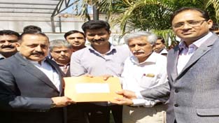 Union Minister Dr Jitendra Singh receiving a cheque for flood relief from a delegation of Jammu University Teachers Association (JUTA) led by its President, Dilip Singh Jamwal at Jammu on Sunday.