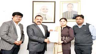 Union Minister Dr Jitendra Singh receiving a memorandum from a delegation of young Civil Services officers, led by Member of Parliament from Barabanki, U.P. , Priyanka Singh Rawat, at New Delhi on Monday.
