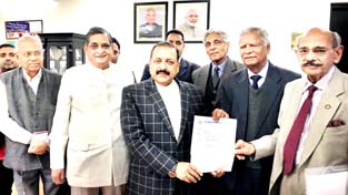 Union Minister Dr Jitendra Singh receiving a memorandum from a pensioners’ delegation, led by senior Member of Parliament R.K. Sinha, at New Delhi.