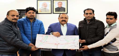 Union Minister Dr Jitendra Singh receiving a Railway line plan prepared by a group of young technocrats representing “Nav Kathua Nirman Samiti”, at New Delhi on Friday.