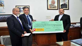 Union Minister Dr Jitendra Singh receiving a cheque of Rs 1.3 crore for flood relief in Jammu & Kashmir from MD & CEO of Vijaya Bank, Kishore Sansi at New Delhi on Tuesday.