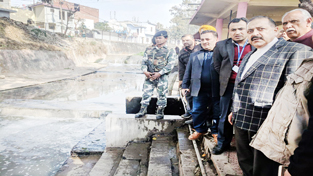 Union Minister Dr Jitendra Singh visiting the site of river Devika project at Udhampur on Tuesday. Also seen are MP Shamsher Singh Manhas and Deputy Commissioner Ravinder Kumar.
