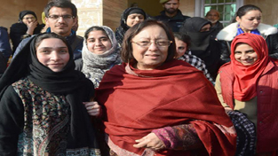 Union Minister for Minority Affairs Najma Heptulla interacting with girl students after the inauguration of first Skill Development Centre at Gandhi Bhawan of Kashmir University in Srinagar, on Wednesday. — Excelsior/Amin War