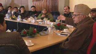 Union Minister for New & Renewable Energy Dr Farooq Abdullah chairing a meeting at Srinagar on Tuesday.