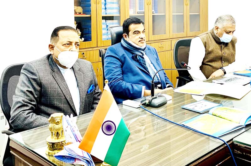 Union Minister for Road Transport & Highways Nitin Gadkari, flanked by Union Minister Dr. Jitendra Singh, reviewing the plan for developing a world – class Hill Station near Zojila, on Monday.