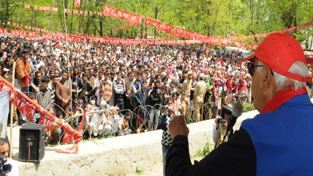 Union Minister of New and Renewable Energy, Dr Farooq Abdullah addressing party workers during an election rally at Pattan on Sunday. —Excelsior/Amin War