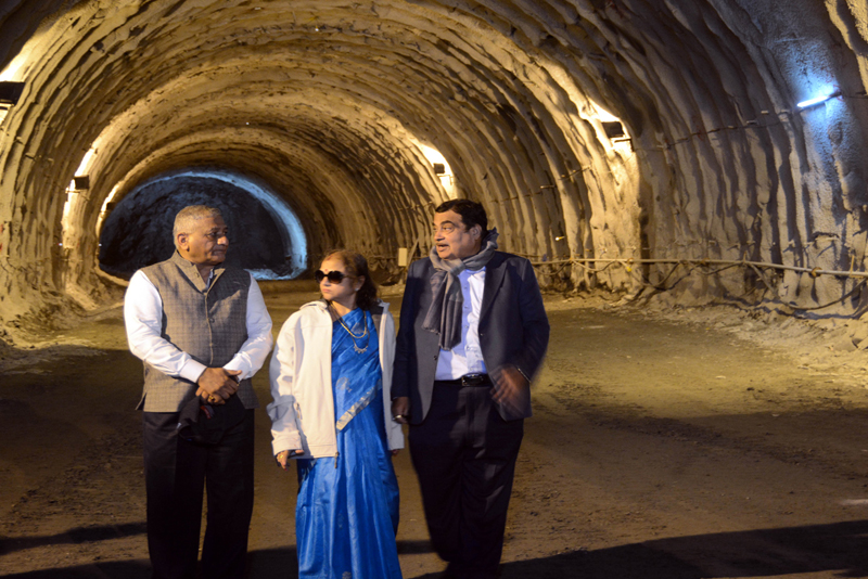 Union Minister of Road Transport and Highways Nitin Gadkari flanked by his wife Kanchan Gadkari and Minister of State Gen (Retd) V K Singh in the under construction Z-Morh tunnel on Tuesday. -Excelsior/Basharat Ladakhi