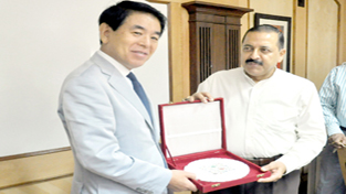 Union Minister for Science & Technology Dr Jitendra Singh welcoming Japanese Minister for Science & Technology Hakubun Shimomura at Anusandhan Bhawan in New Delhi on Tuesday.