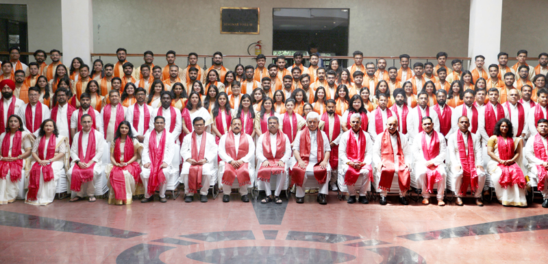 Union Ministers Dharmendra Pradhan & Dr Jitendra Singh along with Lt Governor Manoj Sinha posing for a group photograph with IIM Jammu faculty & MBA passouts during 6th convocation of the Institute on Friday.