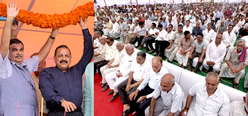 Union Ministers Nitin Gadkari and Dr Jitendra Singh waving to the people at a function at Kathua on Friday. -Excelsior/Rakesh