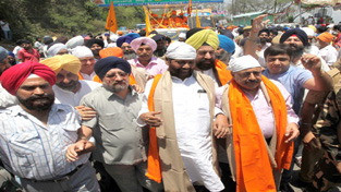 Union Ministers Ram Vilas Paswan and Dr Jitendra Singh receiving Baba Bandha Singh Bahadur Yatra at Jammu on Tuesday. —Excelsior/Rakesh