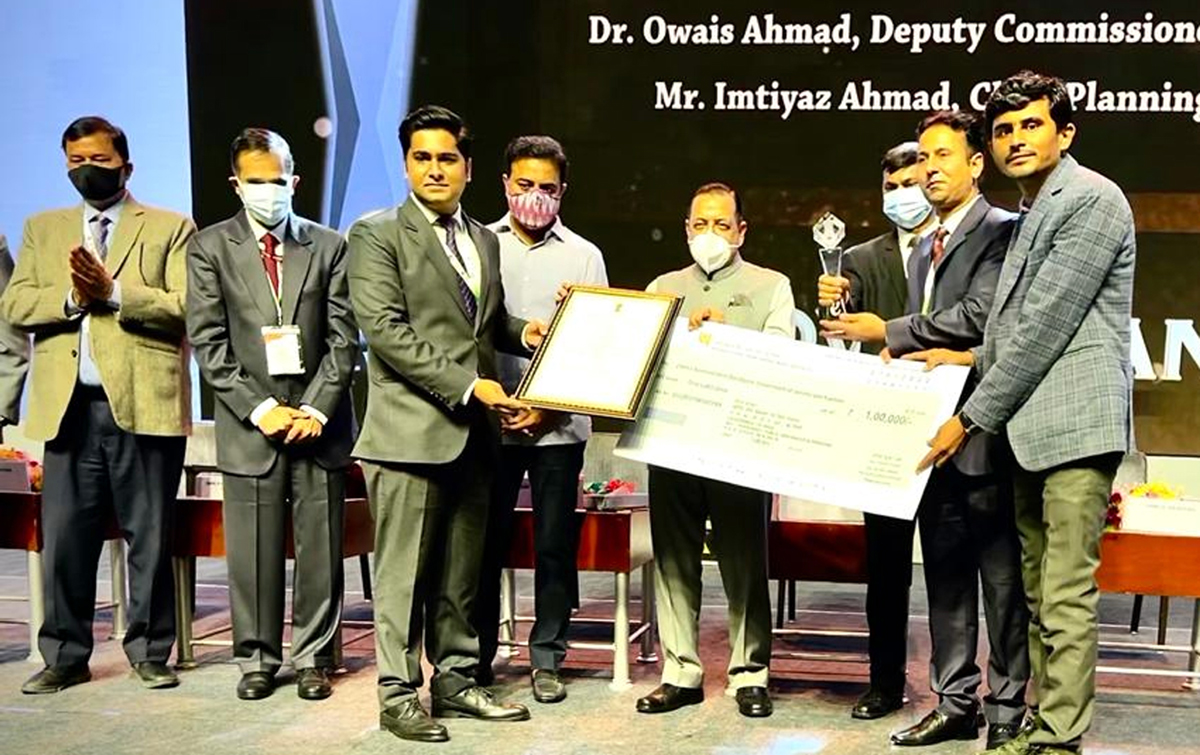 Union MoS, Dr Jitendra Singh presenting award to DC Bandipora Dr Owais Ahmed in Hyderabad on Friday.