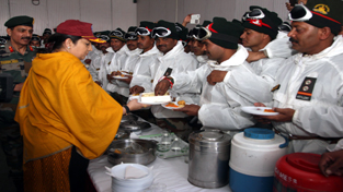 Union Textiles Minister Smriti Irani serving food to Army jawans at Siachen Glacier on Thursday.