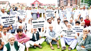 Under the banner of Semi-Ring Road Land Owners Welfare Committee the angry protestors raised anti-Government slogans. They were holding placards reading “NHAI, do not act as East India Company” and “Ring road, destroying our future”.