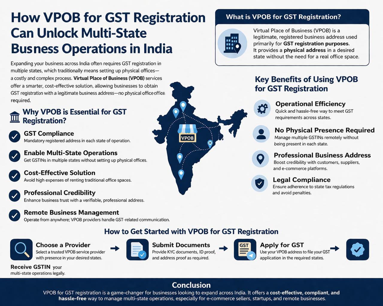 - Multi-State GST Registration: With a VPOB, firms can register for GST in more than one state without having to open an office in each one. This independence makes it easier for merchants to expand their enterprises across the country.
