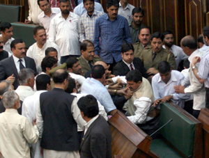 JAMMU, Mar 19: An unprecedented situation prevailed in the Legislative Assembly today during Question Hour—first on the issue of Speaker Mubarak Gul’s decision to reject five resolutions on return of mortal remains of 2001 Parliament attack convict Mohammad Afzal Guru when Jammu based Opposition MLAs especially NPP legislator Balwant Singh Mankotia grappled with Independent MLA Engineer Rashid in the Well of the House forcing the Speaker to adjourn the House.