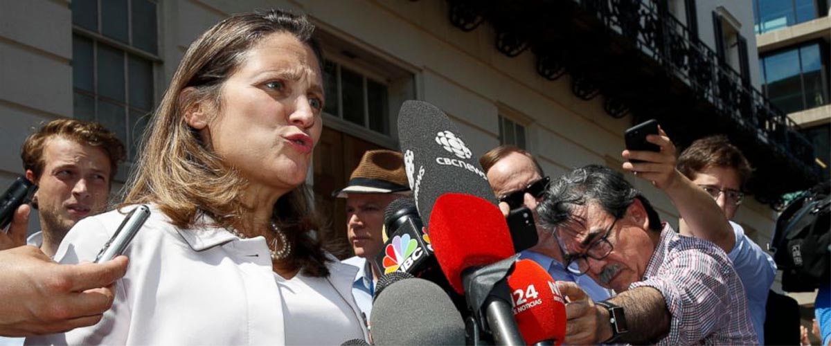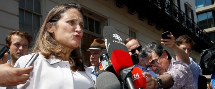 Canadian Foreign Minister Chrystia Freeland met for less than five minutes late Thursday night with US Trade Representative Robert Lighthizer. She told reporters she “had a couple of things to say.”