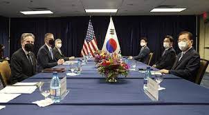 Blinken said at a news conference after the meeting that North Korea was “in a phase of provocation” and the three countries condemned the recent missile launches.