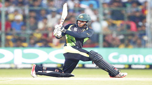 Usman Khawaja executing a sweep shot during his half century against Bangladesh in World Cup T20 match at Bangalore on Monday.