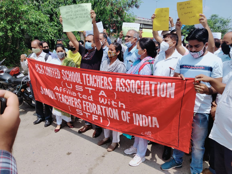 JAMMU, July 15: A large number of activists of J&K United School Teachers Association (USTA) gathered outside Press Club here under the leadership of President Rajeev Kumar and held protest demonstration to project long pending demands of teachers and non teaching staff over which the authorities have adopted a lackadaisical approach.