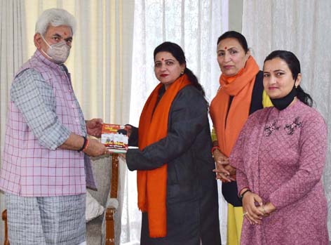 JAMMU, Feb 13: Safina Baig, DDC Chairperson Baramulla; Rekha Sharma, BJP leader and Chairperson Beti Bachao Beti Padhao Abhiyan, J&K UT; president JD(U) J&K and former President JKHC Bar Association, Jammu, today called on Lieutenant Governor Manoj Sinha at Raj Bhavan.