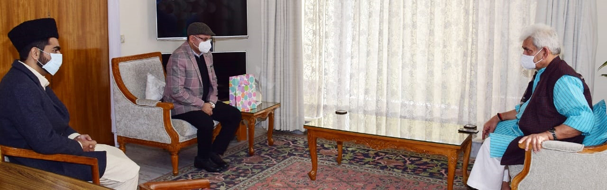 The delegation of Ahmadiyya Muslim Jamaat, Jammu, led by its President, Gohar Hafeez Fani and Laeeq Ahmad Naik, Missionary Incharge, apprised the Lt Governor about various peace initiatives and charitable programmes undertaken by the community for establishing peace and harmony in the Union Territory of Jammu and Kashmir. The deputation also assured their cooperation in the overall welfare of Jammu and Kashmir.