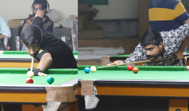 Varun Sethi and Hardik Gupta aiming at targets during 28th Jammu District Billiards and Snooker Championship at Jammu on Friday.