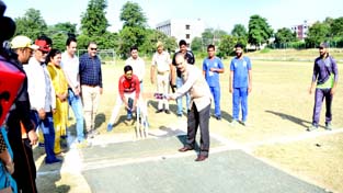 VC JU Prof Manoj Dhar testing his cricketing skills while inaugurating North Zone T20 Cricket tournament for Deaf in Jammu.