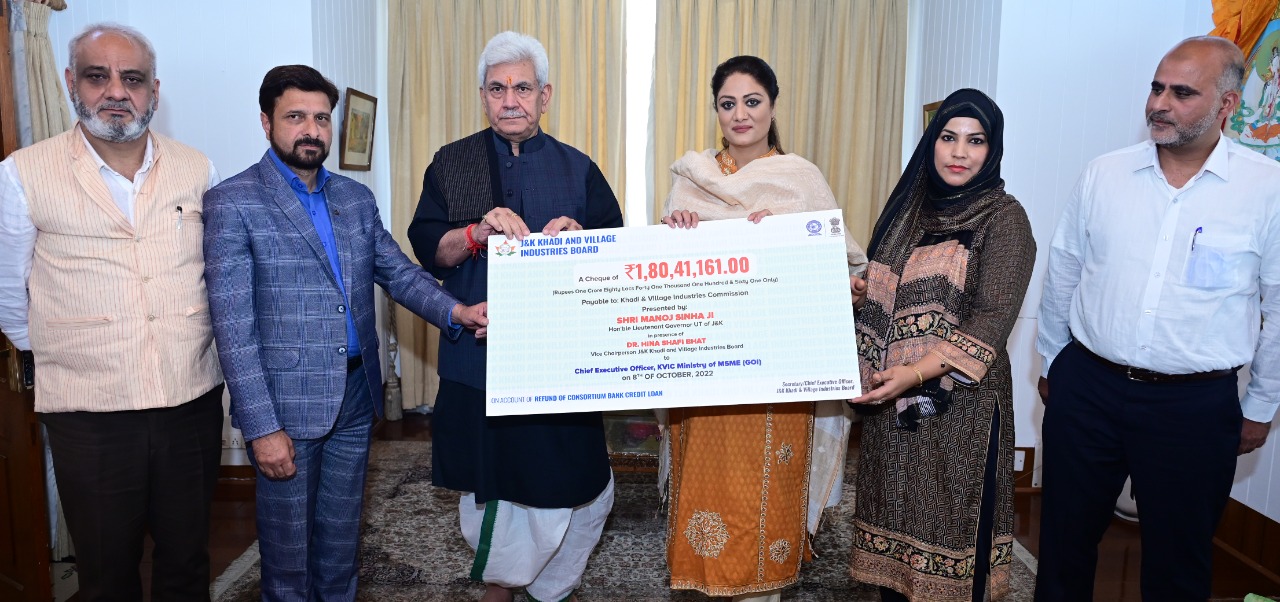 Srinagar, October 08: Dr Hina Shafi Bhat, Vice Chairperson, J&K Khadi Village and Industries Board (KVIB) today submitted a cheque of Rs 180.41 lakh to be refunded to Khadi Village and Industry Commission (KVIC) to Lieutenant Governor Manoj Sinha, at the Raj Bhavan.
