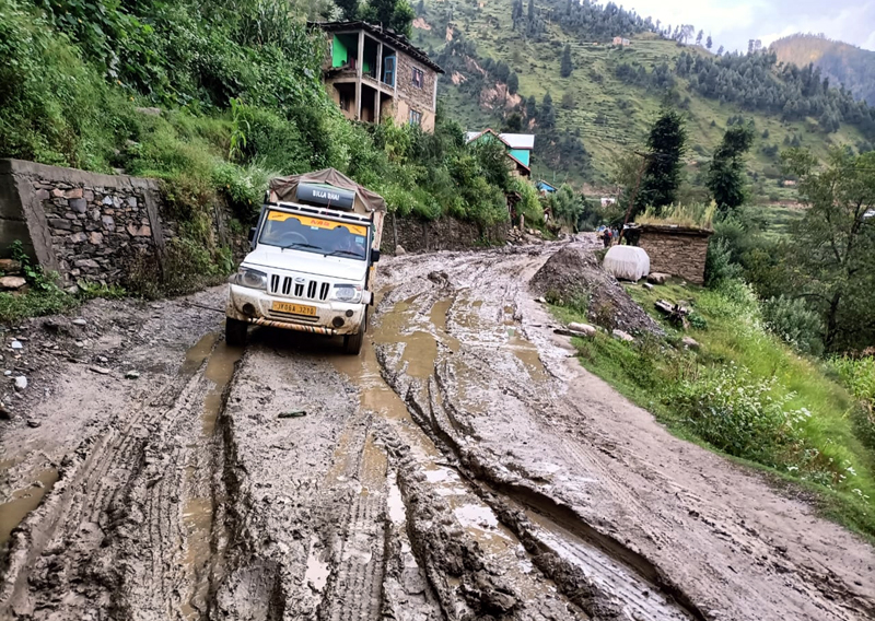 Vehicle passing through muddy area on Chilly-Bhotali road in district Doda. -Excelsior/Rafi Choudhary