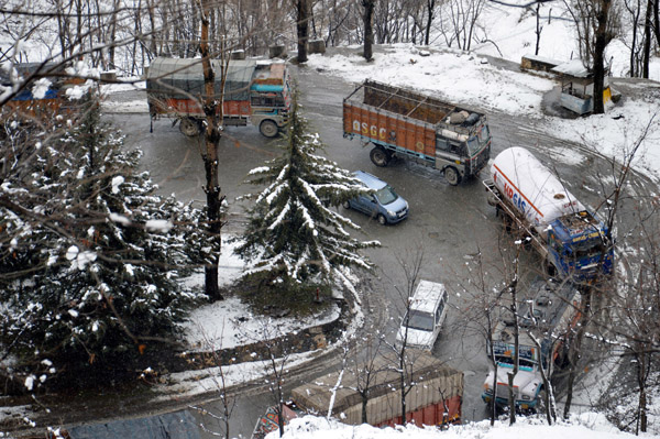 Vehicles moving at snail’s pace at Qazigund following re-opening of Jammu Srinagar National Highway on Friday.                     -Excelsior/ Sajad Dar
