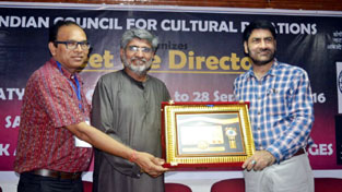 Vice Chairman, National School of Drama Arjun Deo Charan being felicitated by Regional Director ICCR. Also seen in the picture is Suman Kumar, Deputy Secretary (Drama), Sangeet Natak Academi, New Delhi.
