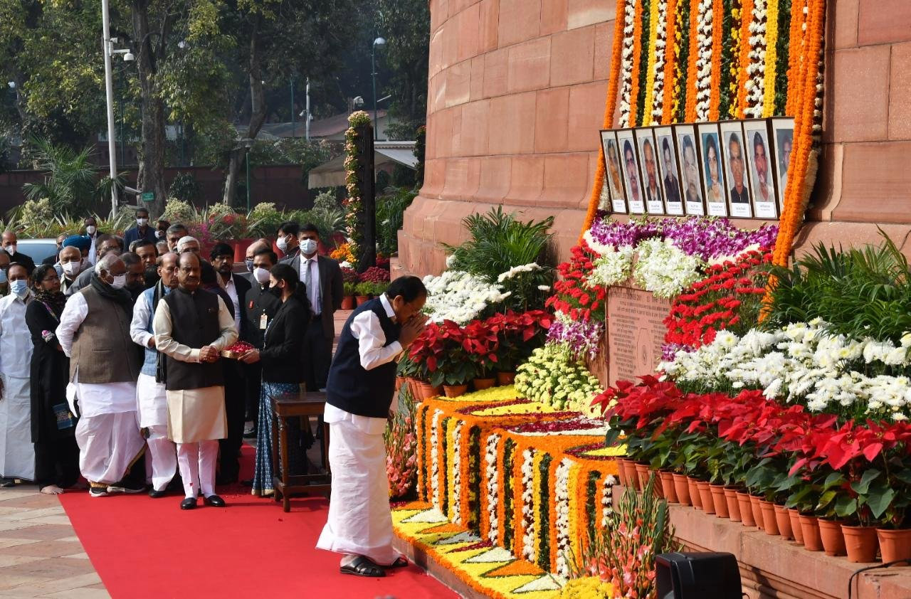 New Delhi, Dec 13: Vice President M Venkaiah Naidu, Defence Minister Rajnath Singh and Lok Sabha Speaker Om Birla paid their tribute to the security personnel who lost their lives in the 2001 Parliament attack on the occasion of its 20th anniversary.